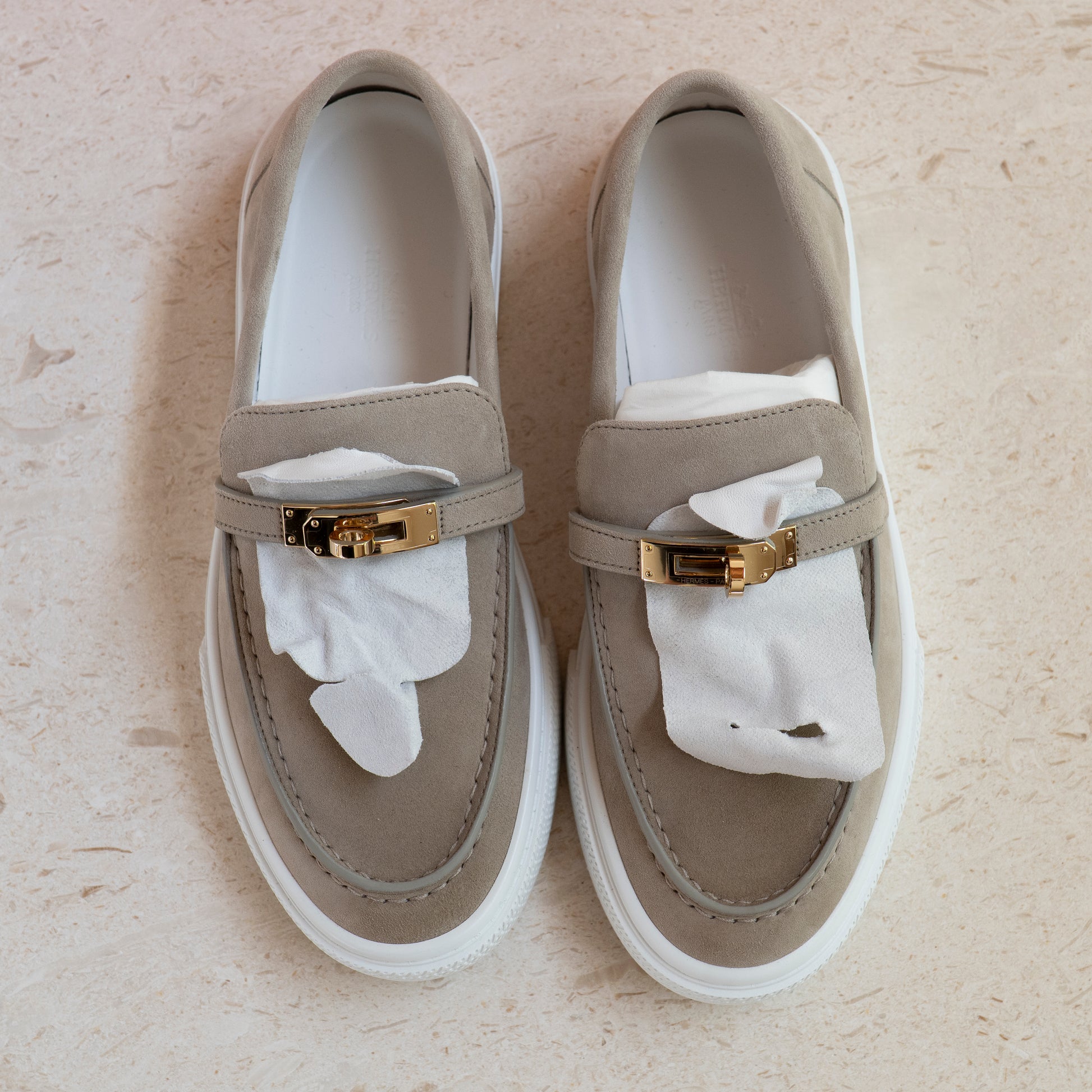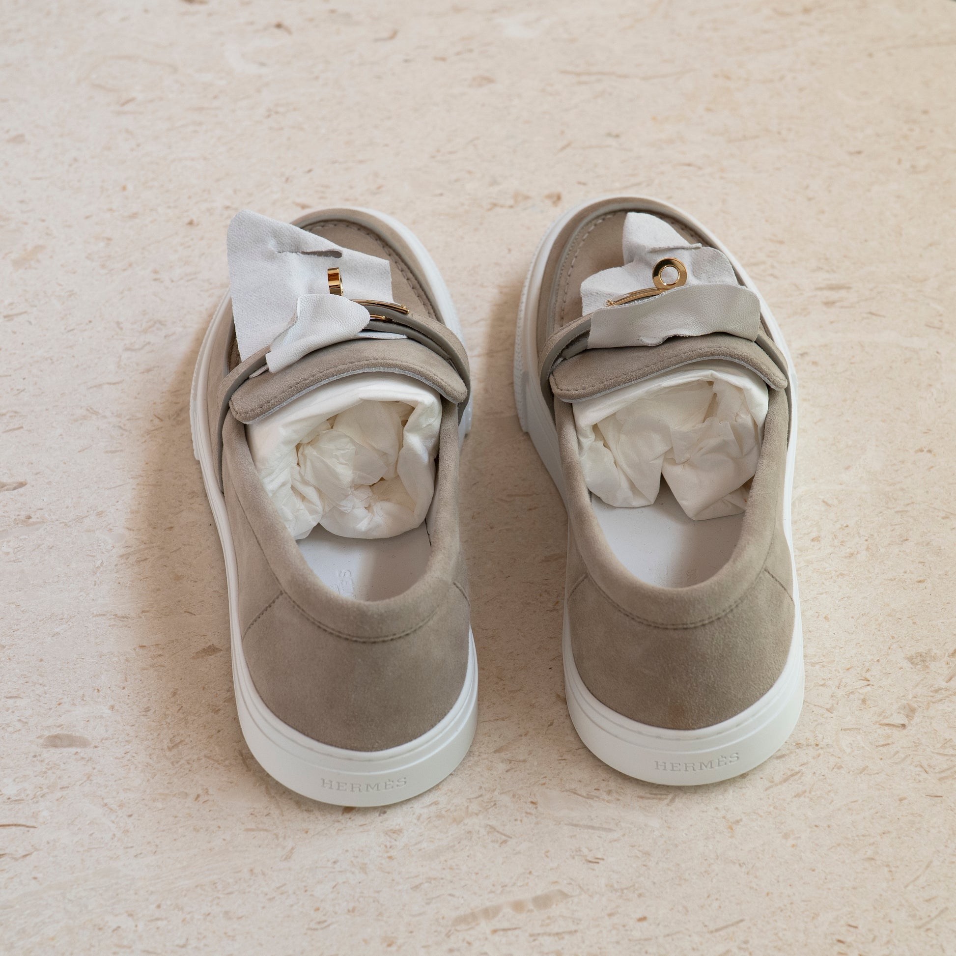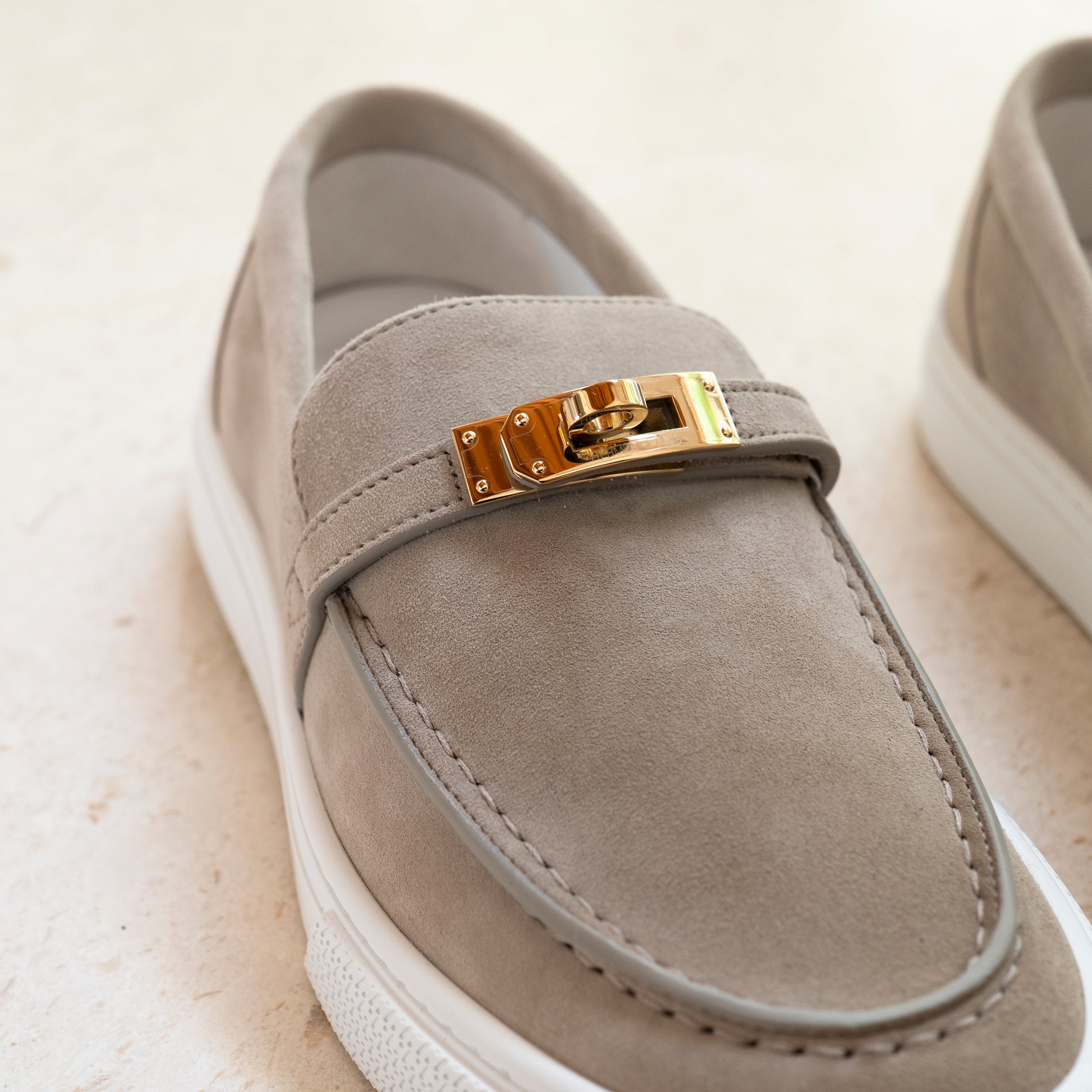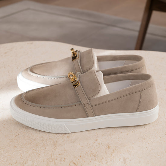 Hermès Game Slip-On Sneaker Size 38 Beige Esquisse Suede with Gold Kelly Buckle