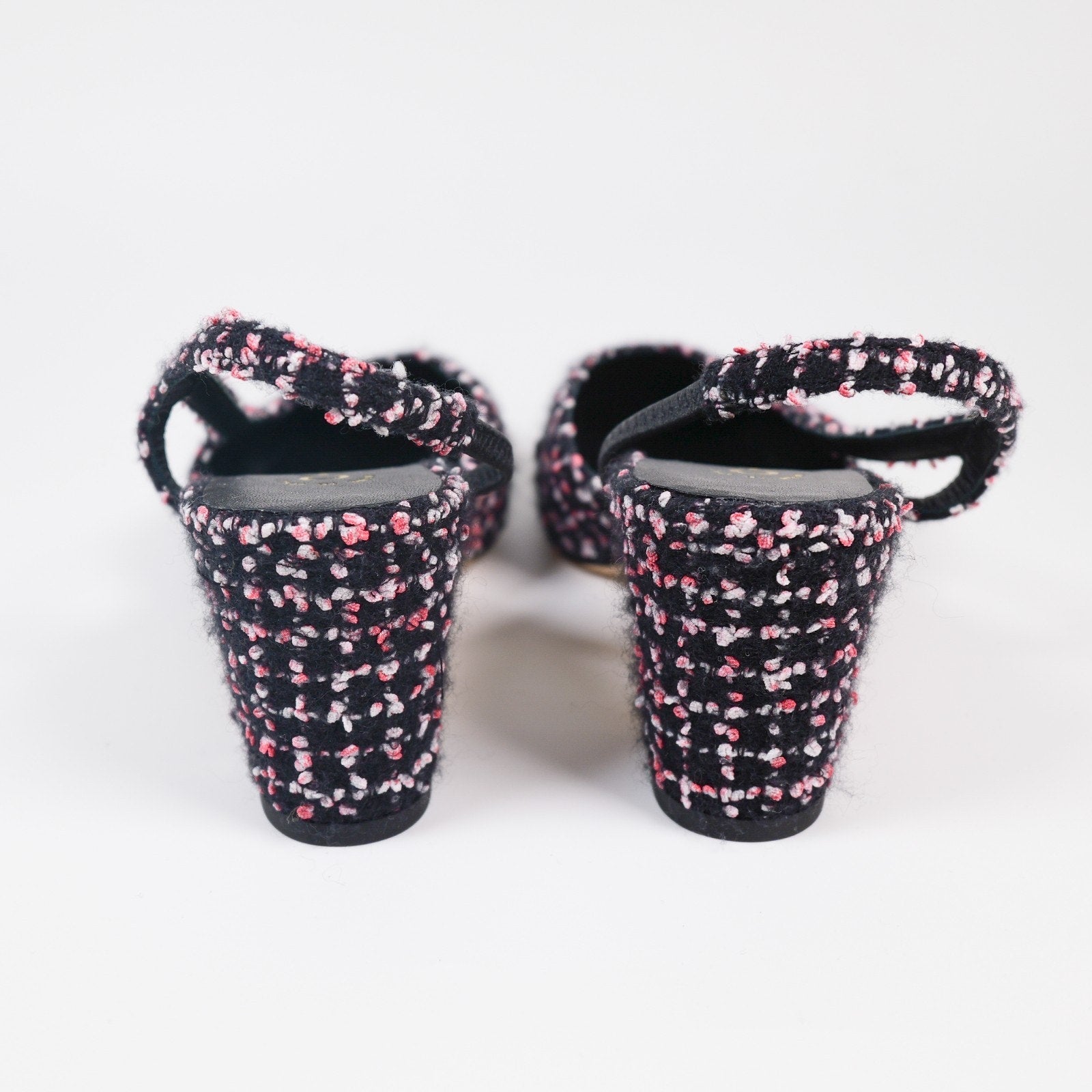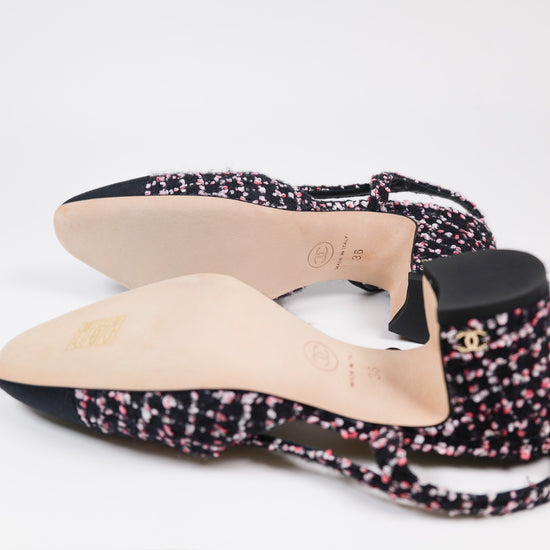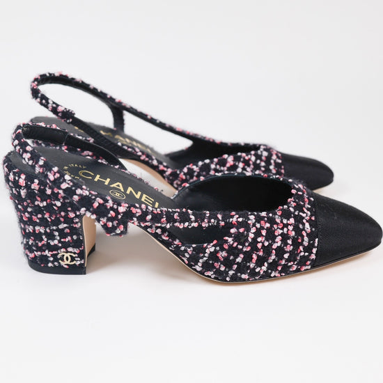 NWOB CHANEL Pink/Black Multicolor Tweed Grosgrain Cap Toe Slingback Pumps EU 36