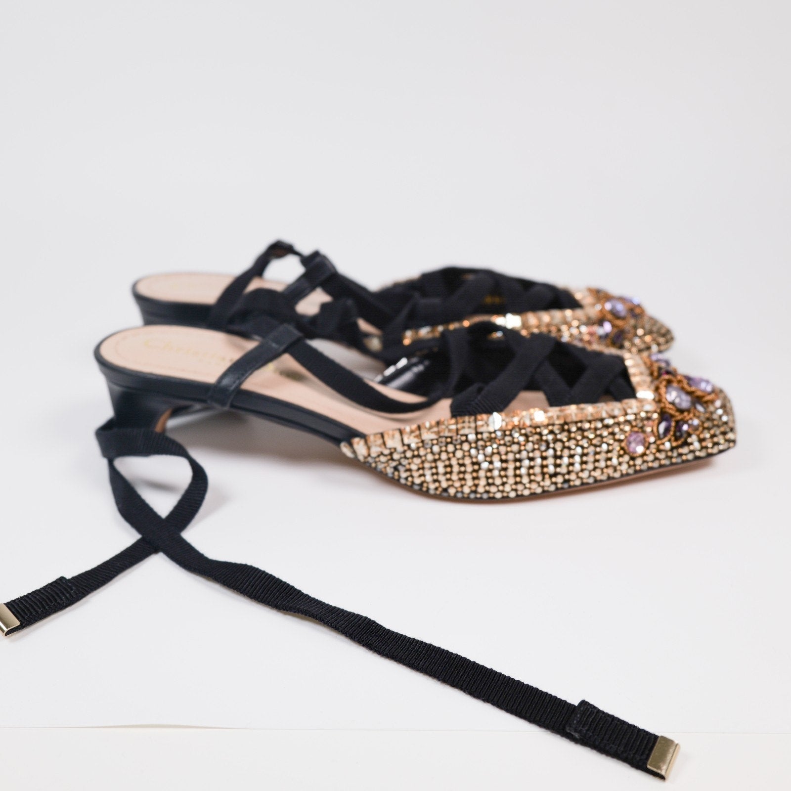 These impossibly ornate Dior kitten heels are covered in dazzling embroidery and crystal embellishments, topped off with lilac teardrop gems in a butterfly-like motif. The elegant pointed toe and black grosgrain ribbon laces wrap beautifully around the ankle, offering the perfect blend of glamour and refinement.