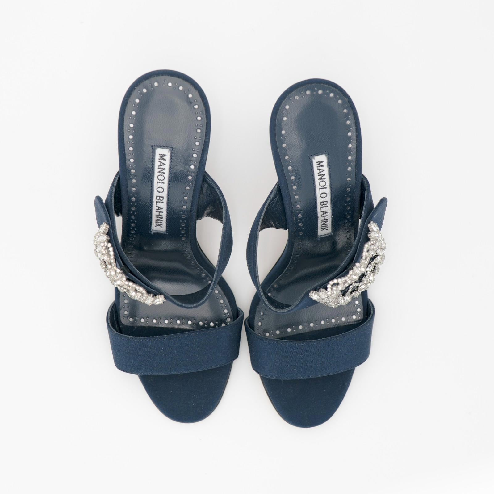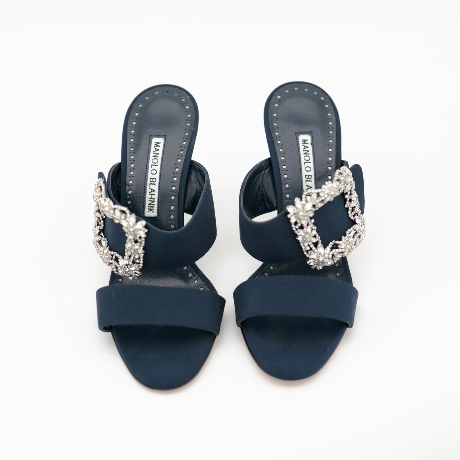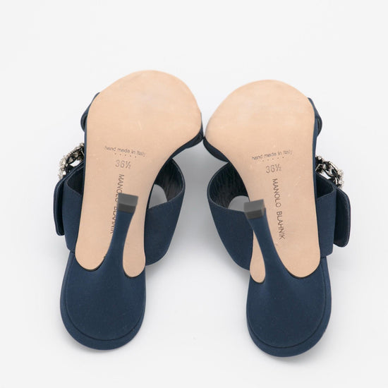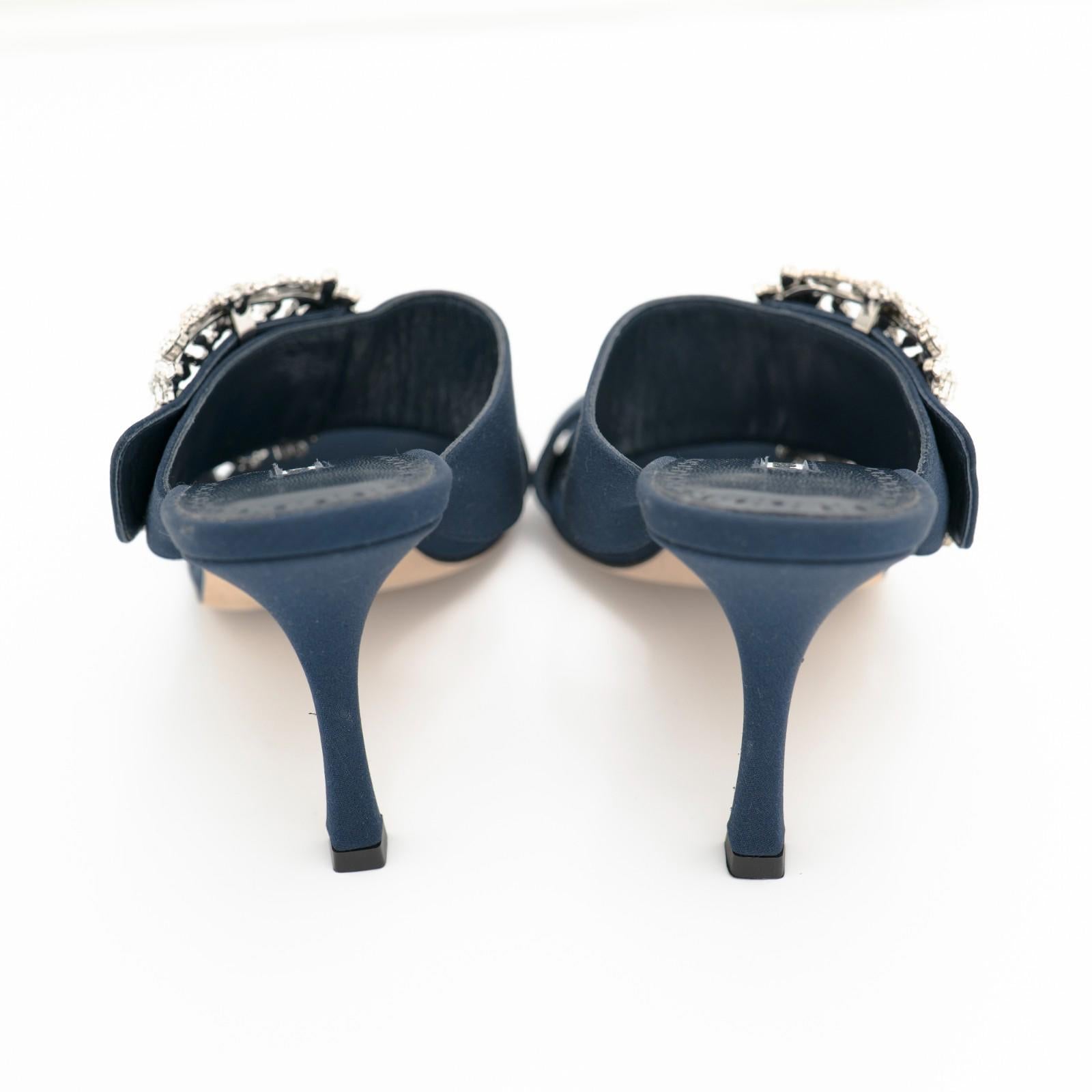 Manolo Blahnik Navy Gable 90 Jewel Buckle Mules EU 36